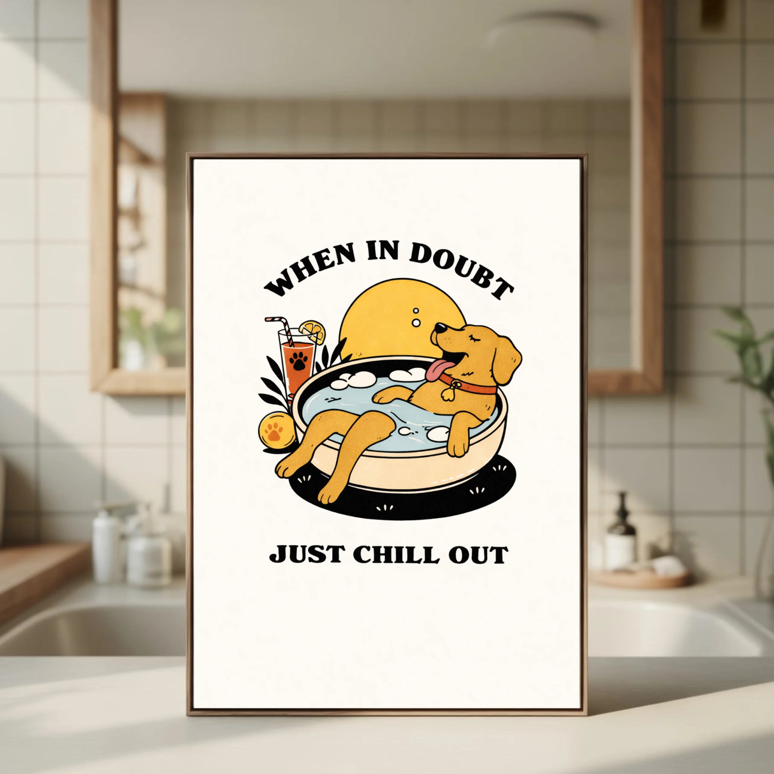 Dog Wall Art For Bathroom printable featuring a relaxed “Just Chill Out” dog illustration in a 3:4 portrait ratio. This high-resolution 300 DPI design fits 6×8, 9×12, 12×16, 15×20, 18×24, 24×32 and 30×40 inch prints. Instant digital download, ready to print.