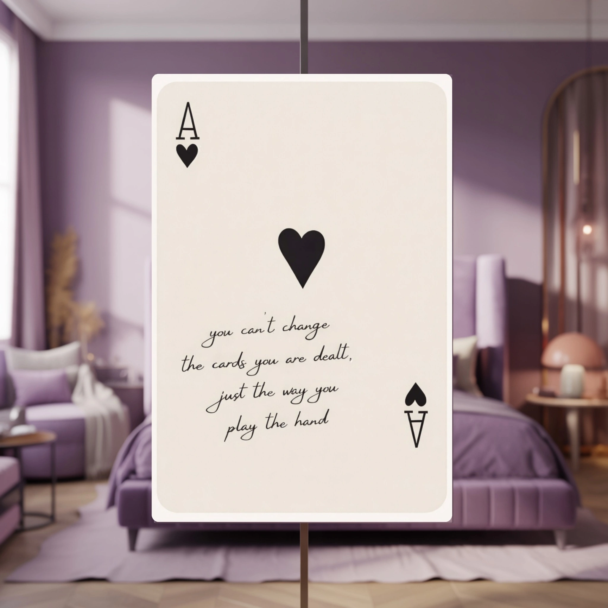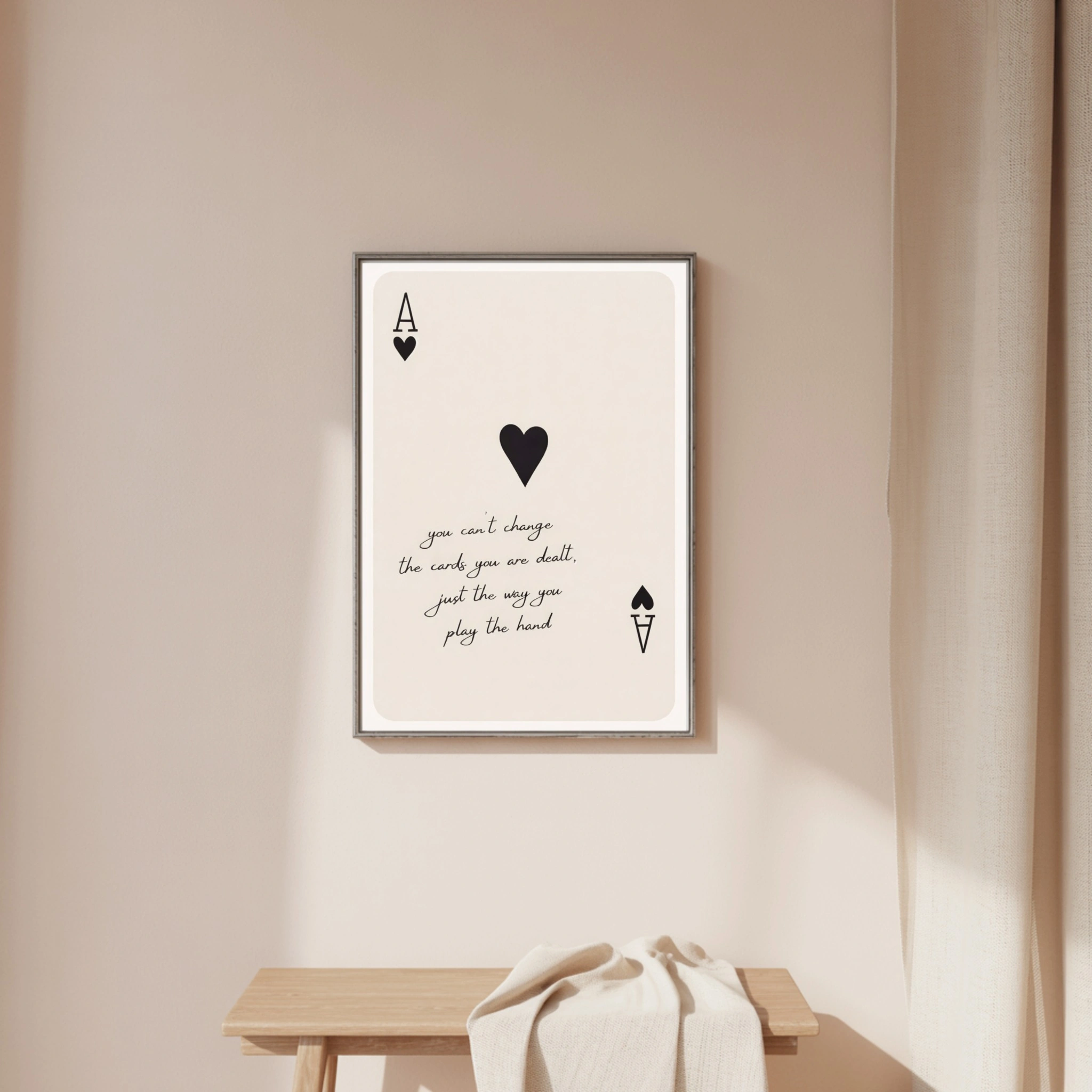Add a touch of minimalist charm and timeless meaning to your space with this elegant Playing Card Wall Art print. Inspired by a classic Ace of Hearts design, this artwork features a soft neutral background, bold black heart symbols, and a motivational quote that reminds you to focus on how you play the hand you’re dealt.
