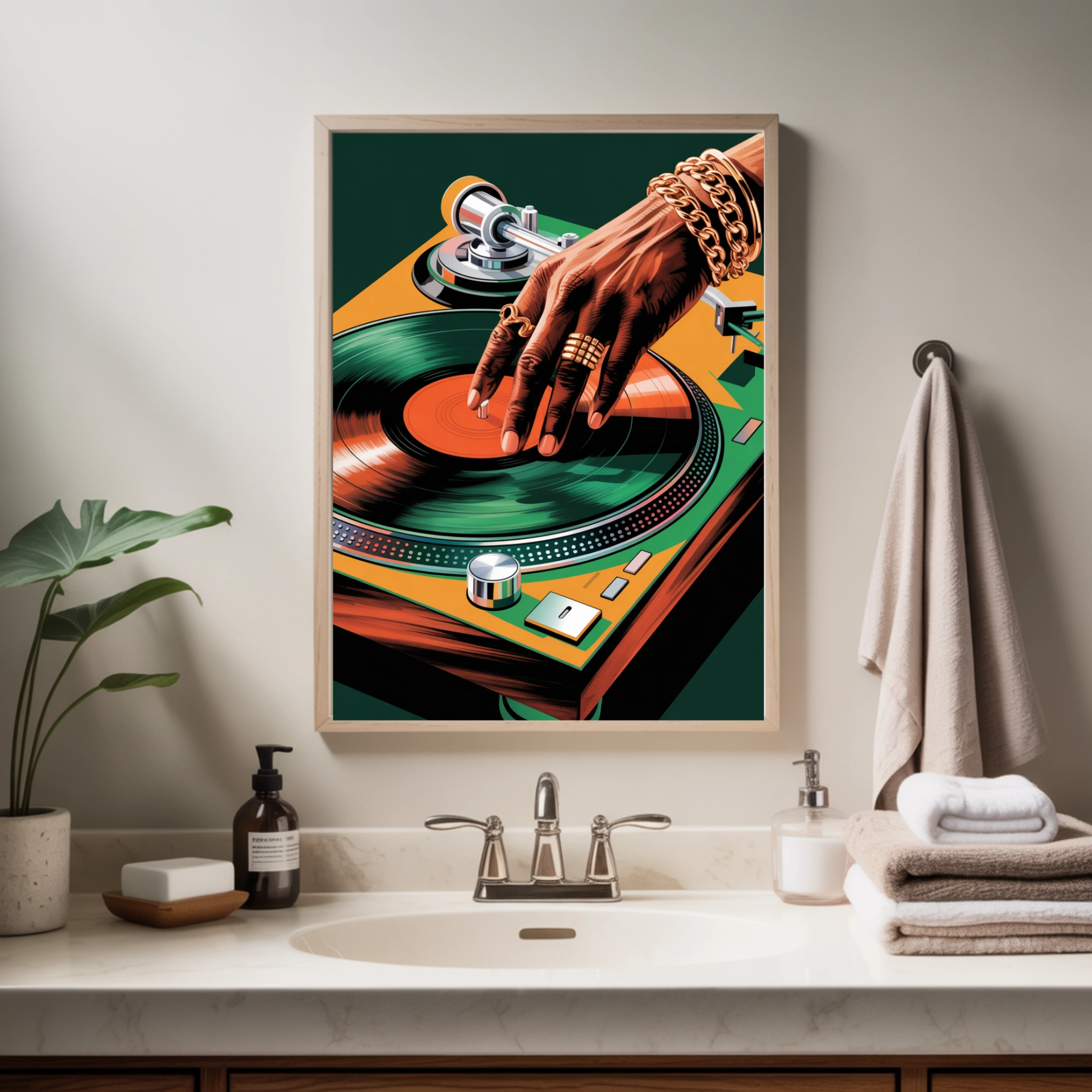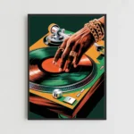 Bring iconic music culture into your space with this bold Vintage DJ Turntable Wall Art, illustrated in a rich retro vector style. The artwork captures the energy of classic vinyl scratching, featuring vibrant greens, oranges and deep shadows for a striking, stylish, music-inspired centrepiece. Designed at ultra-sharp 300 DPI, this print delivers crisp detail and gallery-quality impact in any room.