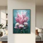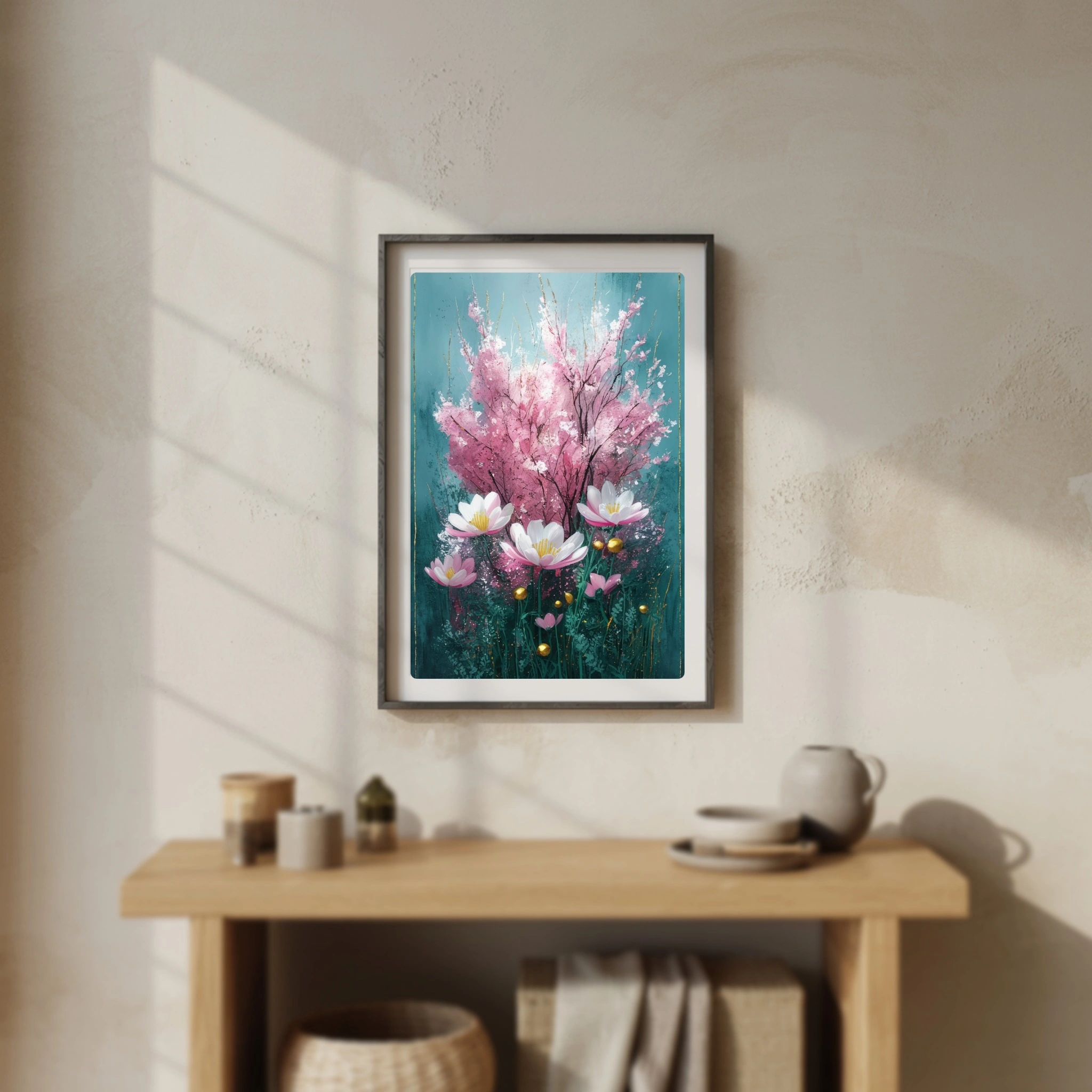 Bring calm, elegance, and natural beauty into your space with this stunning sakura-inspired floral wall art. Featuring soft pink cherry blossoms and delicate wildflowers against a rich teal background with subtle gold accents, this artwork blends modern watercolour style with timeless botanical charm—perfect for serene, stylish interiors.