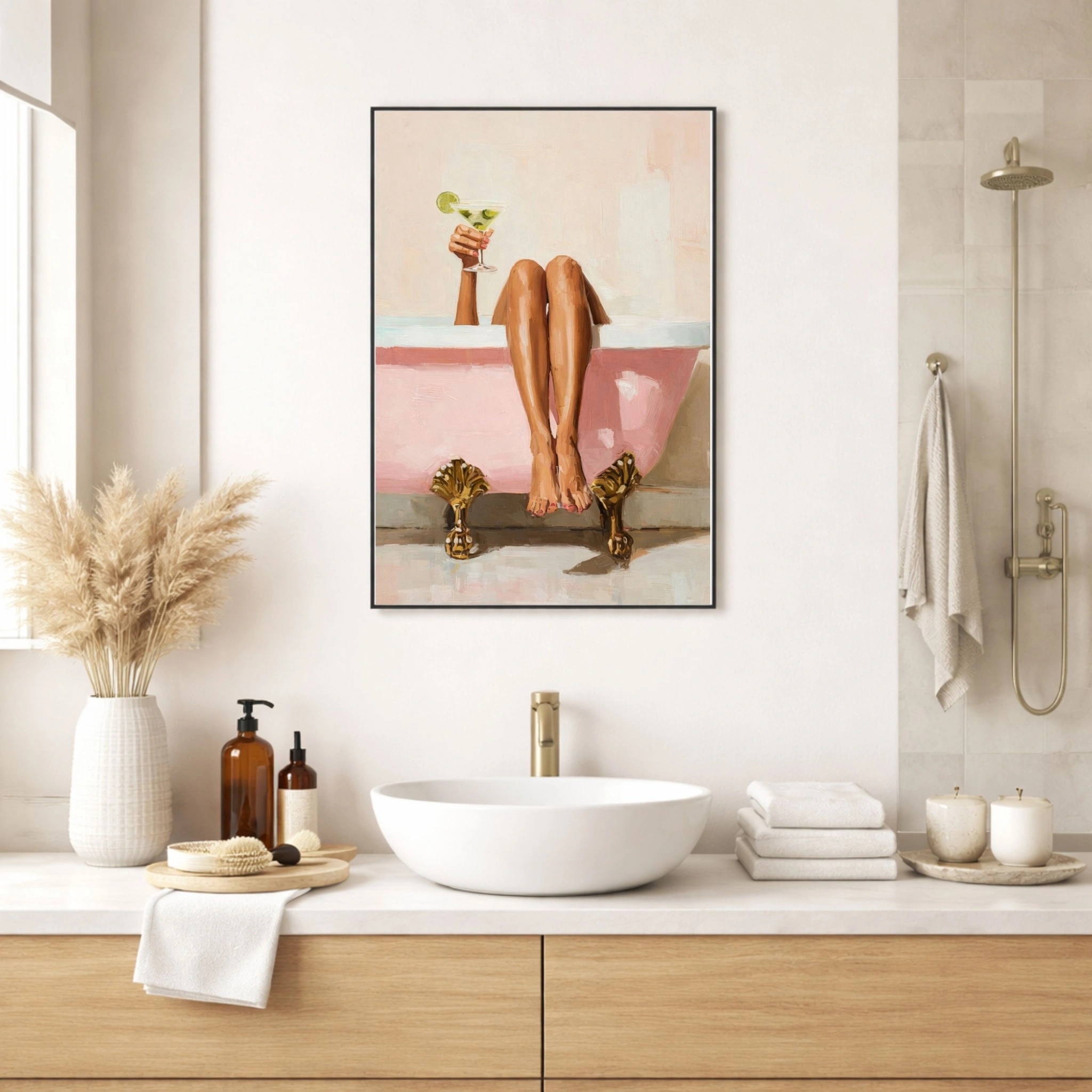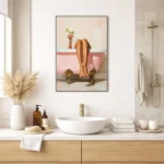 Add a touch of luxury and relaxed sophistication to your space with this striking Modern Bathroom Wall Art. Featuring a stylish painterly scene of a figure relaxing in a vintage bath with soft blush tones and warm neutrals, this artwork brings spa-like calm and contemporary elegance to any interior.