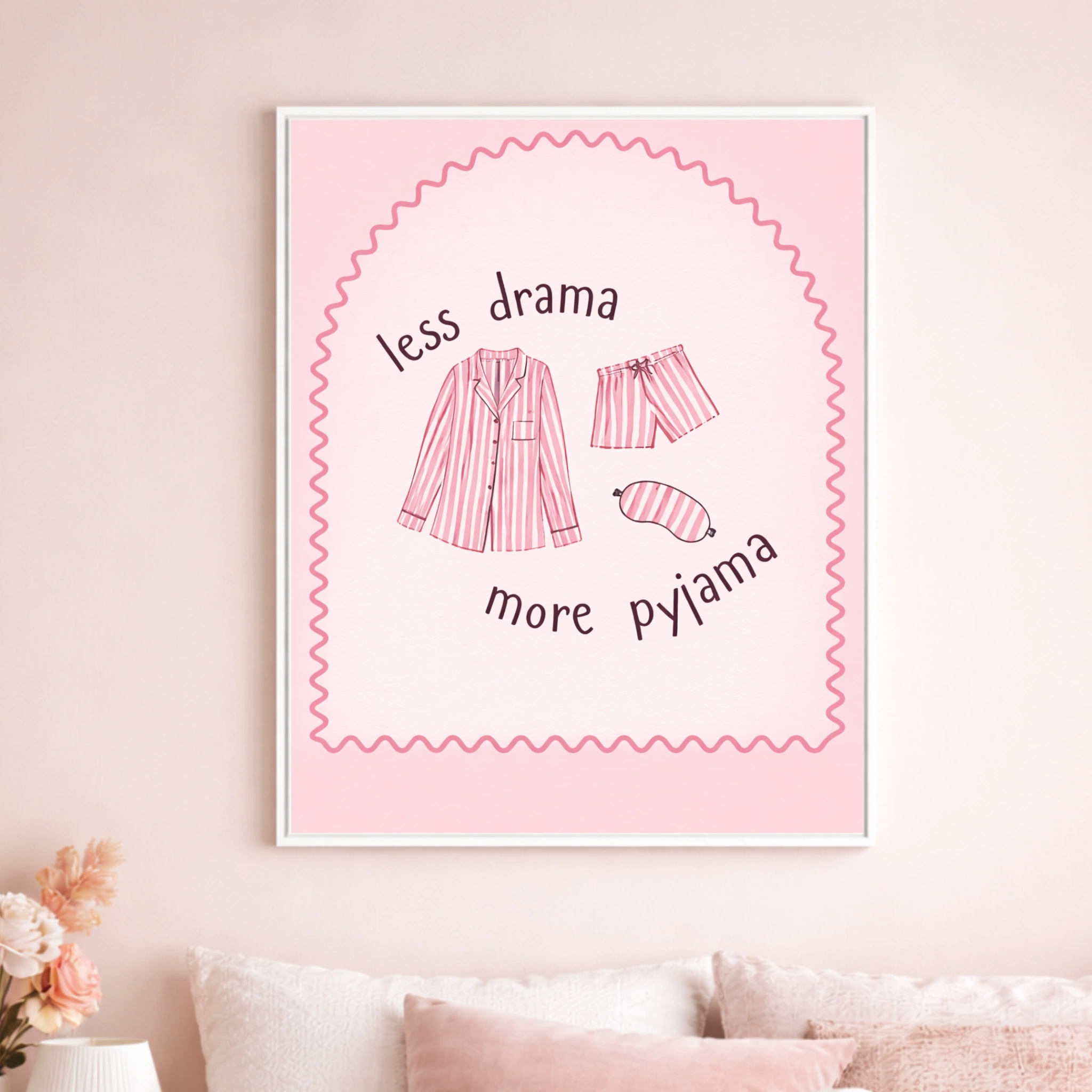 Add playful charm to your space with this wall art girls print featuring the quote “Less Drama More Pyjama” surrounded by pink striped sleepwear illustrations.